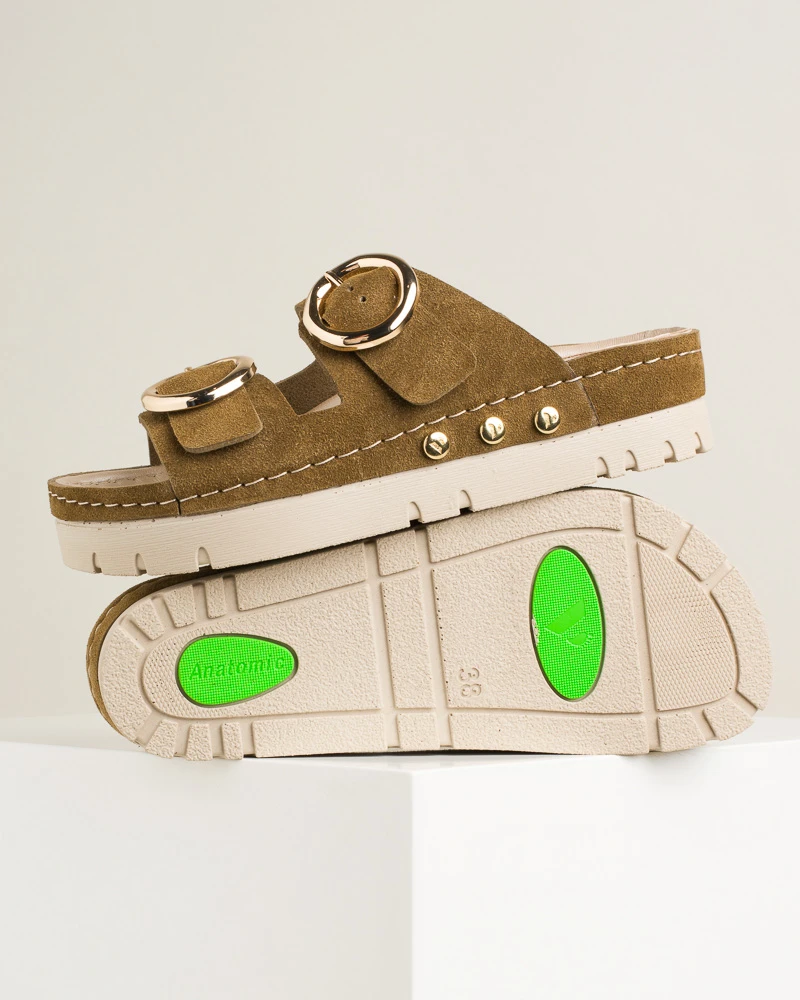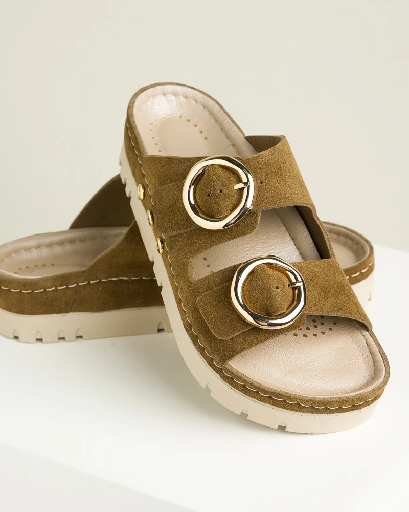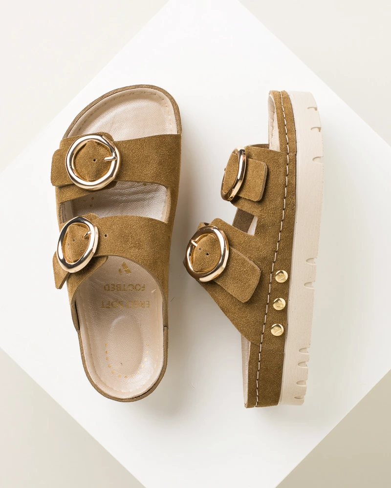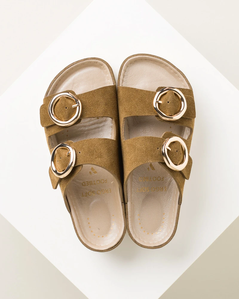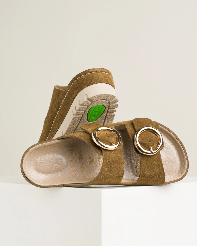Dva podesiva kaiša omogućavaju savršeno prilagođavanje stopalu, dok zemljani tonovi čine ovaj model lako uklopivim uz različite stilove – od opuštenih do elegantnijih kombinacija. Posebno je pogodan za osobe sa osetljivim i bolnim stopalima, kojima je potrebna dodatna mekoća i podrška.